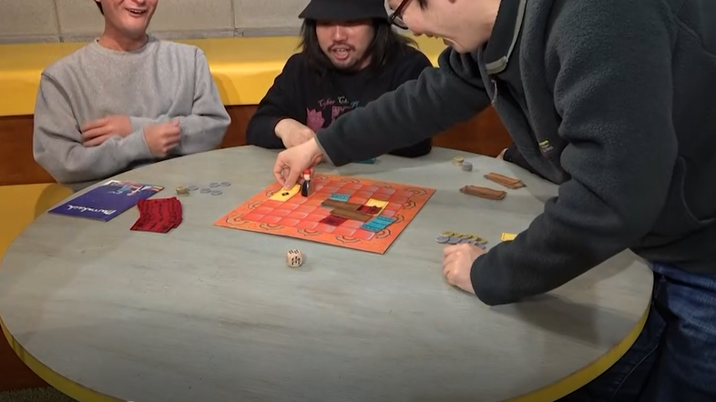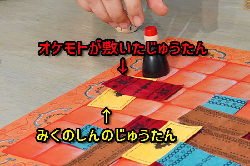 「ここで止まりました。さて、じゅうたんをどこに敷こうかな。他の人が敷いたじゅんたんに重ねて敷くことも可能でしたよね?」