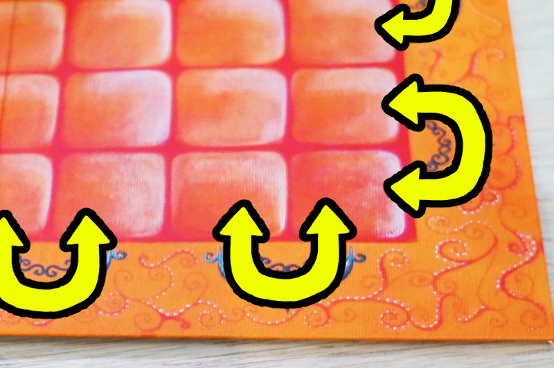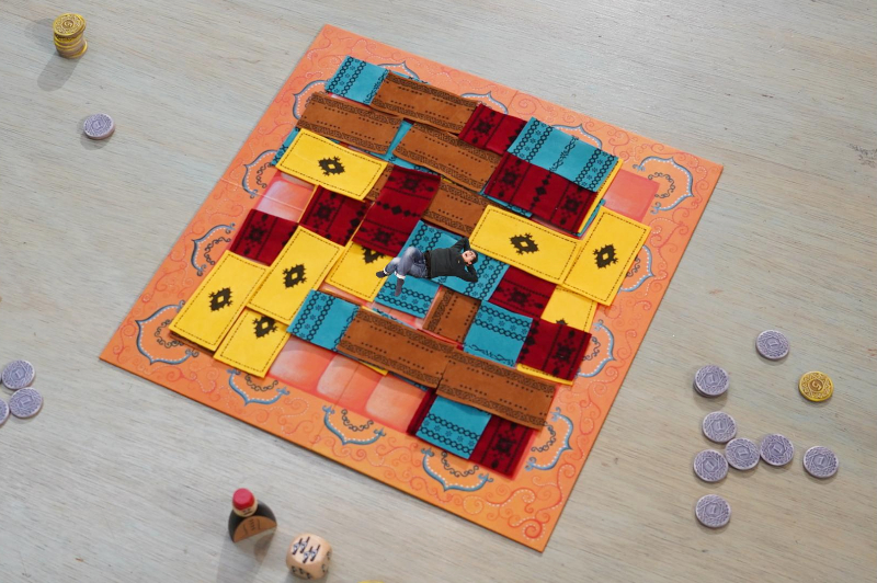 「サイコロの目は4だから、コマを4マス進めて……で、じゅうたんは止まったマスの前後左右どこに置いてもいいんですが、できるだけ真ん中に敷くのがいいと思うんですよね。中央のほうがよく通行するはずだから」