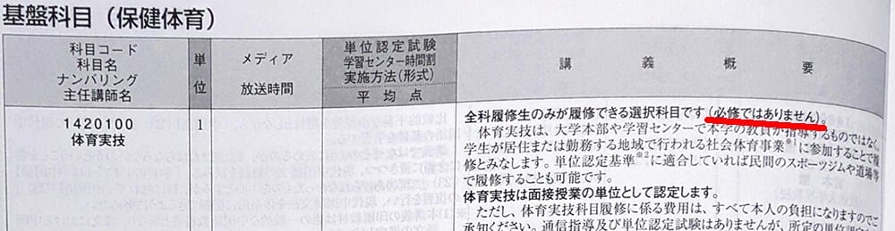 ▲体育実技の科目説明。必修科目ではないと記載されている