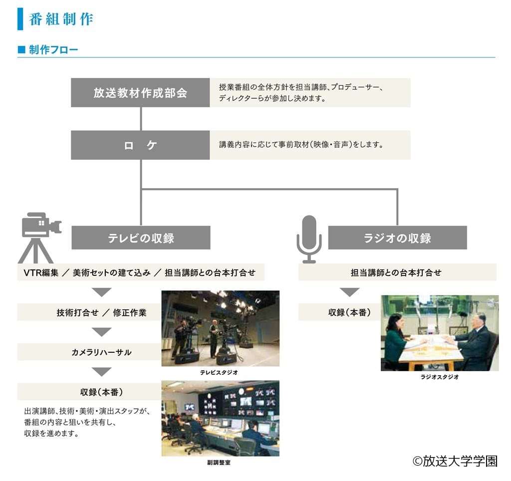 放送の場合、台本作成、収録、編集まで必要ですもんね。そういえば、僕も地上波のTVで放送大学の授業を見たおぼえがあります。9チャンネルで映っていたような……。