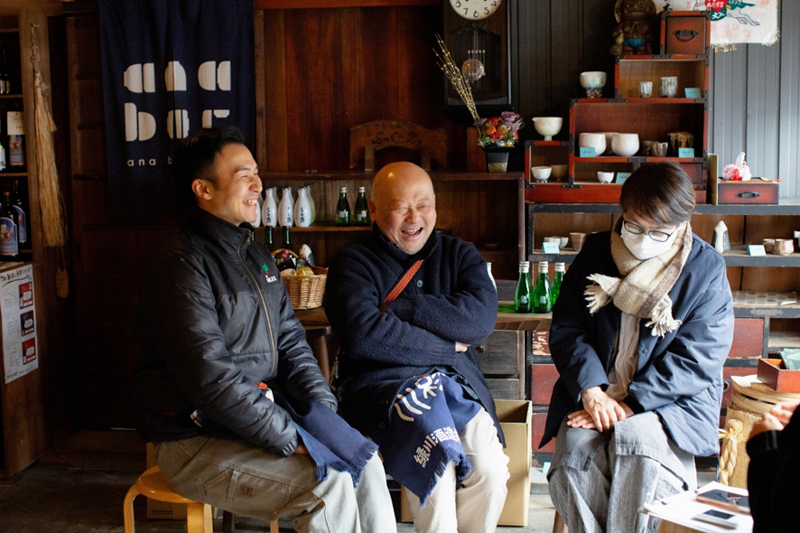 玉木秀典さん(写真中央)、陽子さん(写真右)、鼓太郎さん(写真左)ながせ商店街にある、大正時代創業の老舗酒屋「玉木酒店」の4代目・秀典さん。妻・陽子さん。5代目の長男・鼓太郎さん。酒販店という枠にとどまらず、器の展示やライブを行うなど幅広く活動しています。