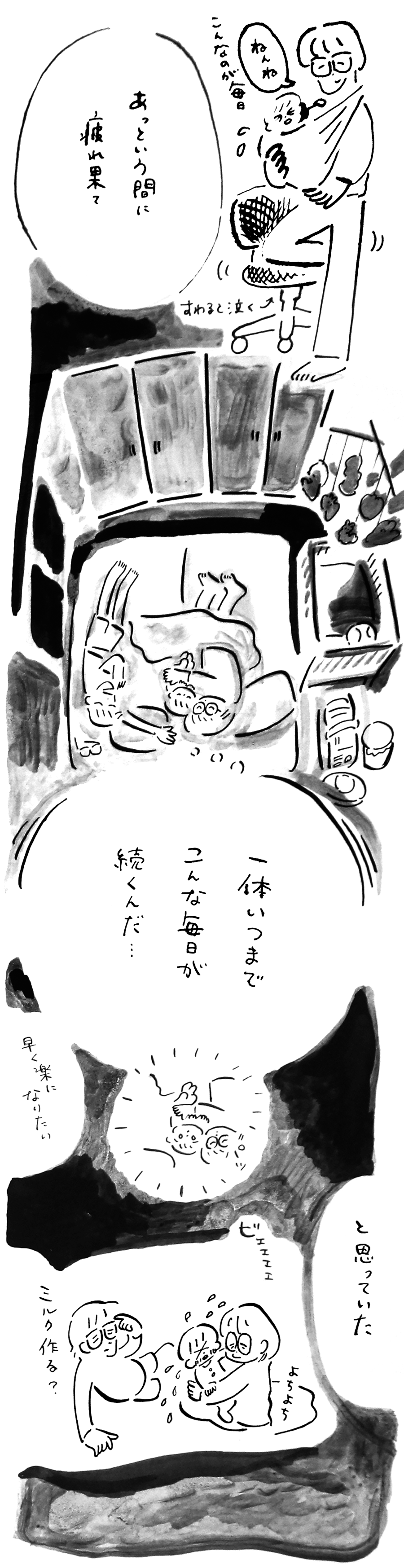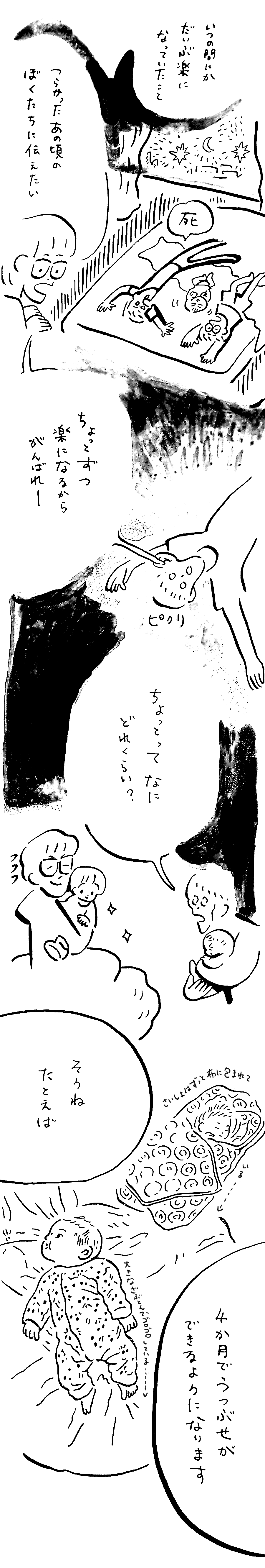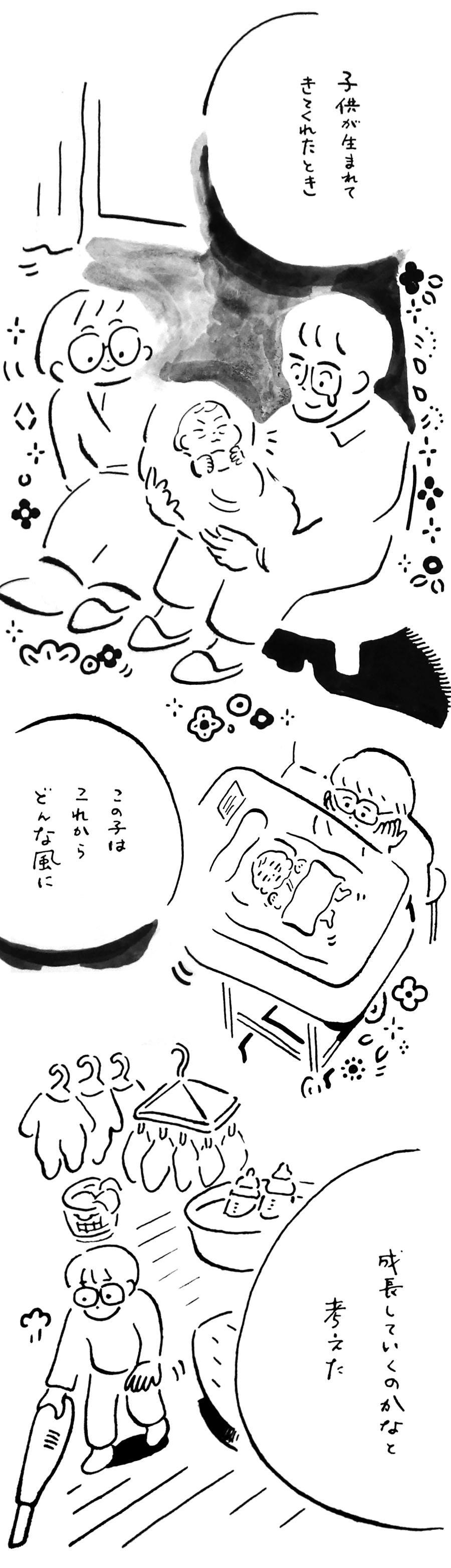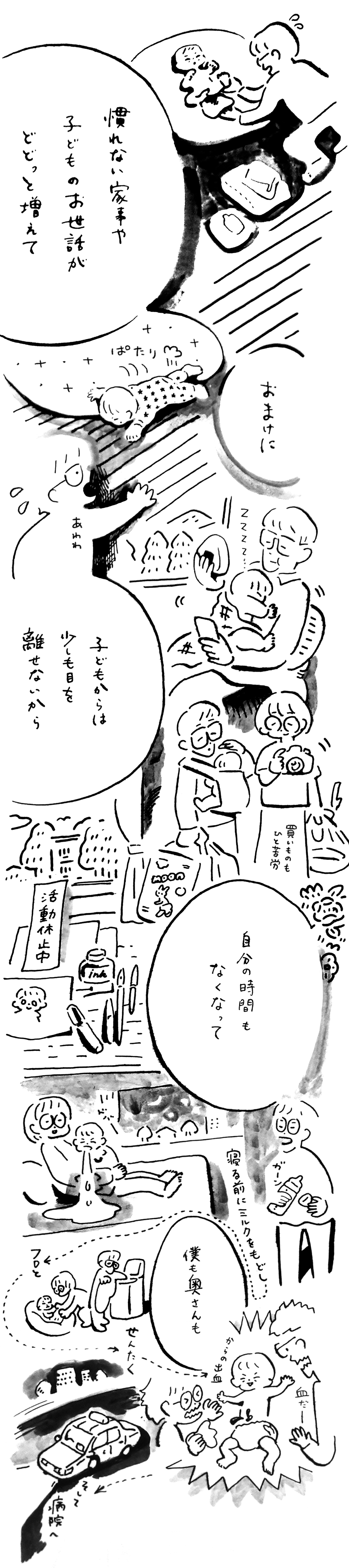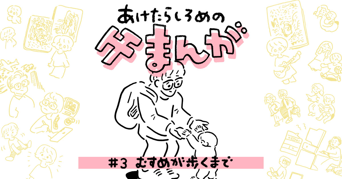 「父親」ってなんだろう? 一児の父でもあるイラストレーター、あけたらしろめによる「父親」をテーマにした物語、父まんがはいよいよ育児編に突入。子どもが生まれた喜びもつかの間、慣れない育児に不安や悩みを感じるしろめ。しかし、その苦労を癒やすのは子どもの成長だった。