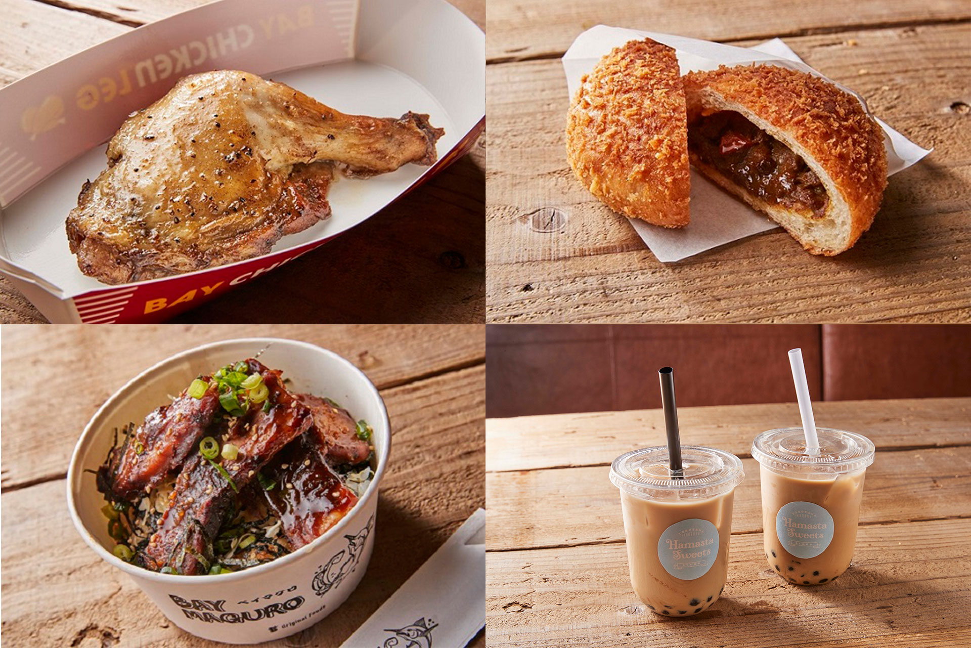ライトスタンド側のフードエリア『BAYSIDE ALLEY』では、様々な食事を楽しむことができる。左上から、『ベイチキンレッグ』『青星寮カレーパン』『ベイマグロ丼』『タピオカドリンク』