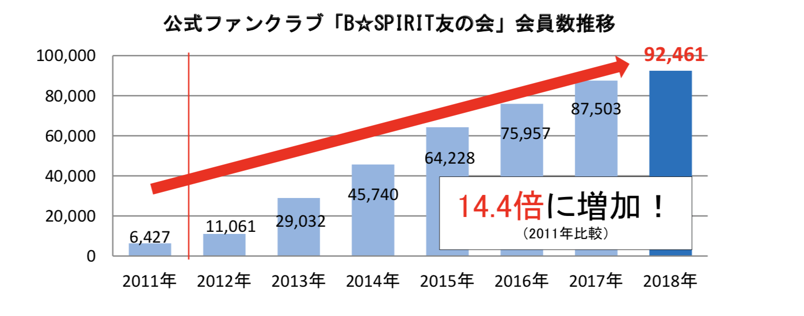 河村さん「おかげさまで、今シーズンが始まってからもたくさんの方に来ていただいています。実際、2011年から2018年で、観客動員数は約110万人から約200万人に、ファンクラブ会員数は約6千人から約9万2千人に増加しました」