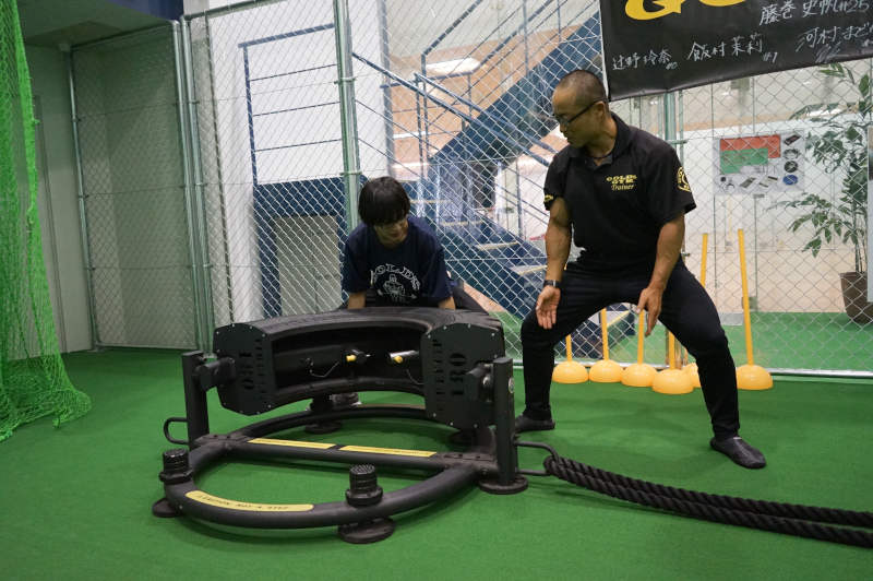 「こちらは『タイヤフリップマシン』と言います。重たいタイヤを起こす動作により、全身の筋力アップや筋肉の連動性が向上するんです」