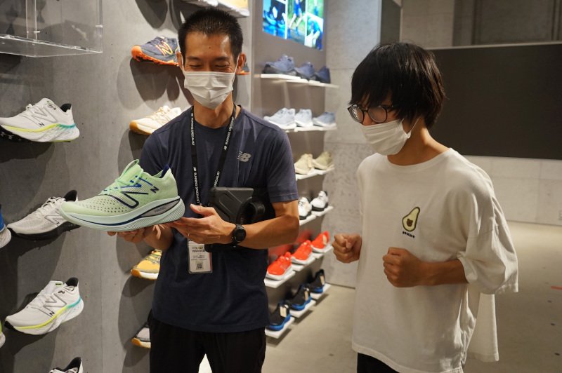 「メーカーによってはウイズはワンサイズしかないこともありますが……少なくともニューバランスでは商品によって複数のウイズをご用意していますね。『足の横幅』『足の甲の圧迫感』に違和感があれば、遠慮なくおっしゃってください」
