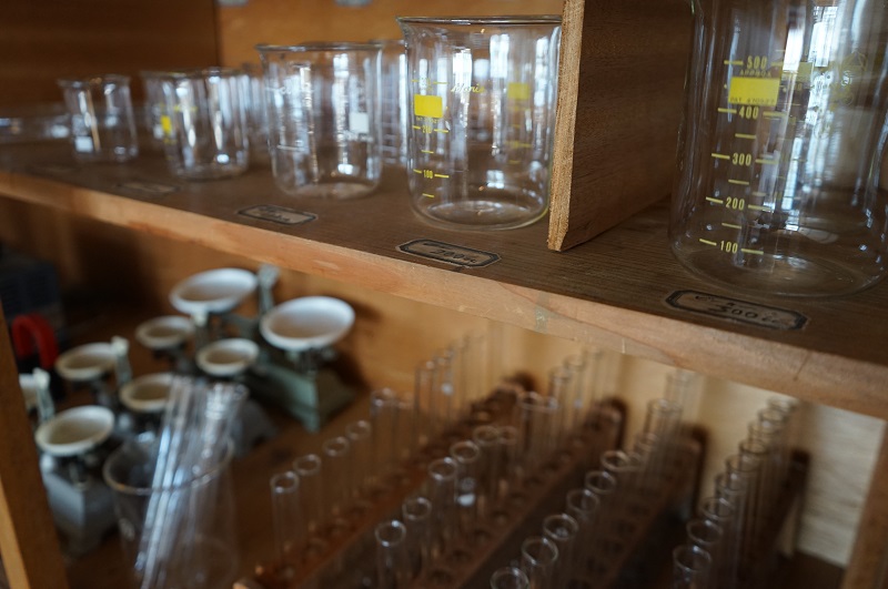 室内の棚にはビーカーやフラスコが並んでいます。