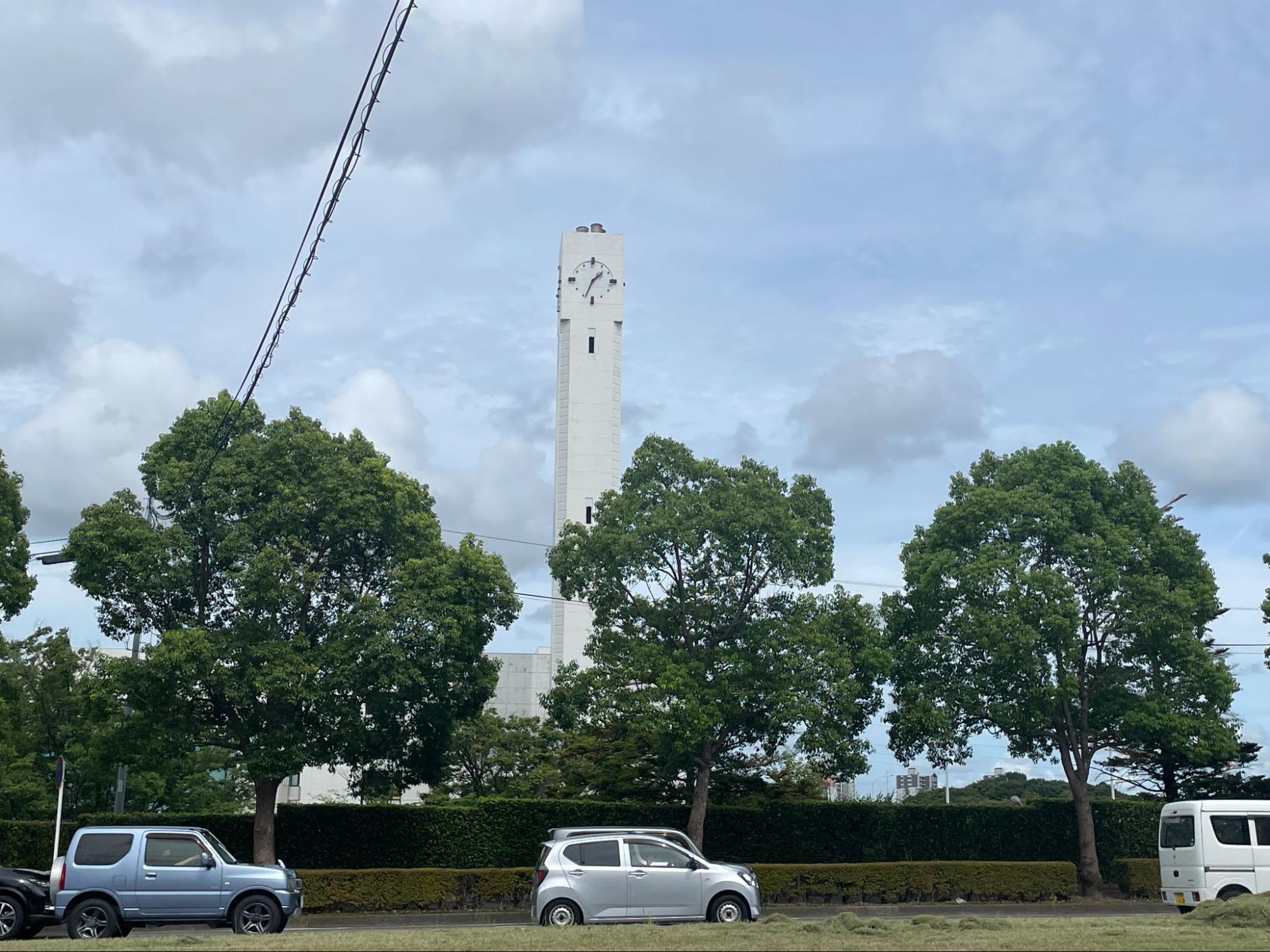 データセンターから少し視線を移すと、真っ白で、すっくと立つ時計塔。