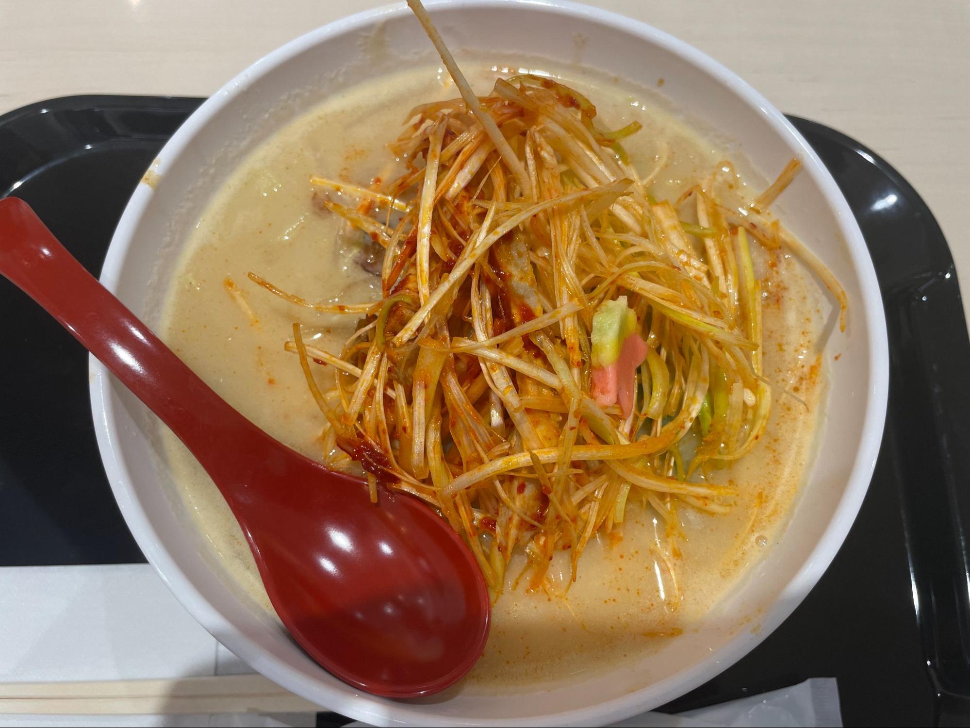 ねぎ肉ラーメン。味噌味だ。思ったよりもピリ辛で結構、汗をかいた