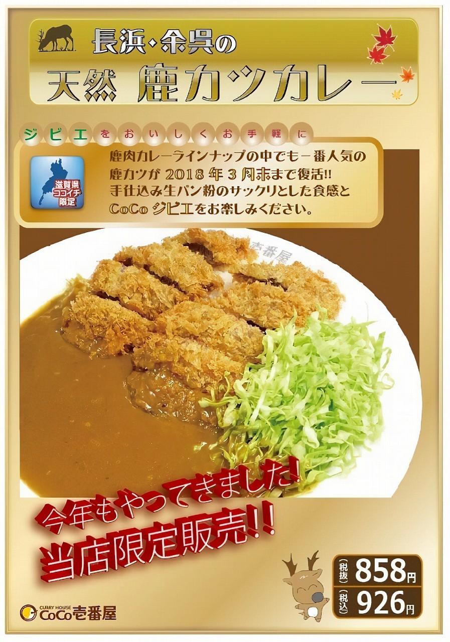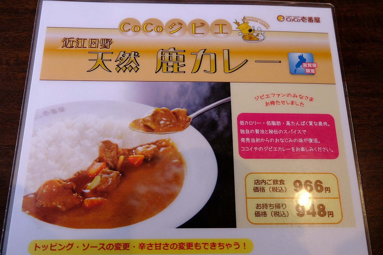 ここで、ココイチの店舗限定メニューでおそらく日本一話題となった「鹿肉カレー」を紹介したい。2010年の発売から10年を過ぎ、いまも滋賀県内の数店舗で提供する。