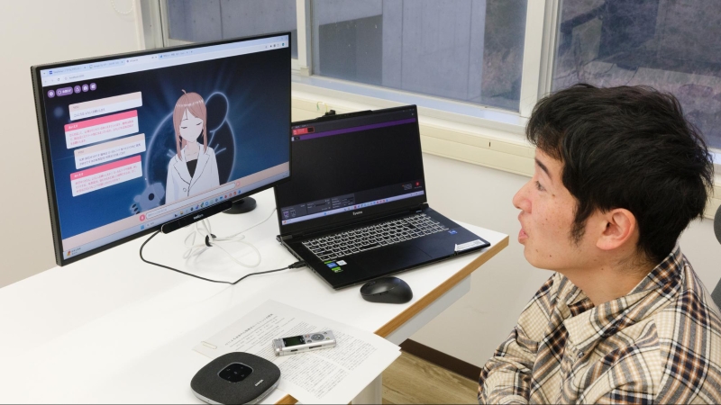 中島研究室で開発中の「AIセラピスト」を体験する筆者。音声認識や自動音声を使い、声でやりとりできるので実際にカウンセリングを受けている感覚