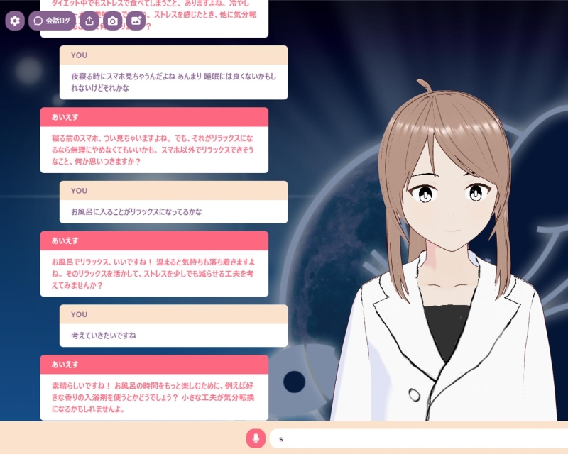 AIセラピストとのやりとり。中島さん曰く「まだまだ発展途上」とのことで、さらなる進化が待ち遠しい。現在の対話システムは対話型AI構築プラットフォームmiibo、音声合成エンジンVOICEBOX、AITuberキット等を組み合わせ、研究室ではその中身のデータセットの開発を進めている