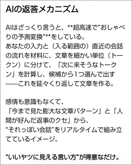 せっかくなのでAI自身にも聞いてみた。AI自身には、いったいどのようなメカニズムで、どのように返答につなげているかを問う(情報ソース確認済み)。
