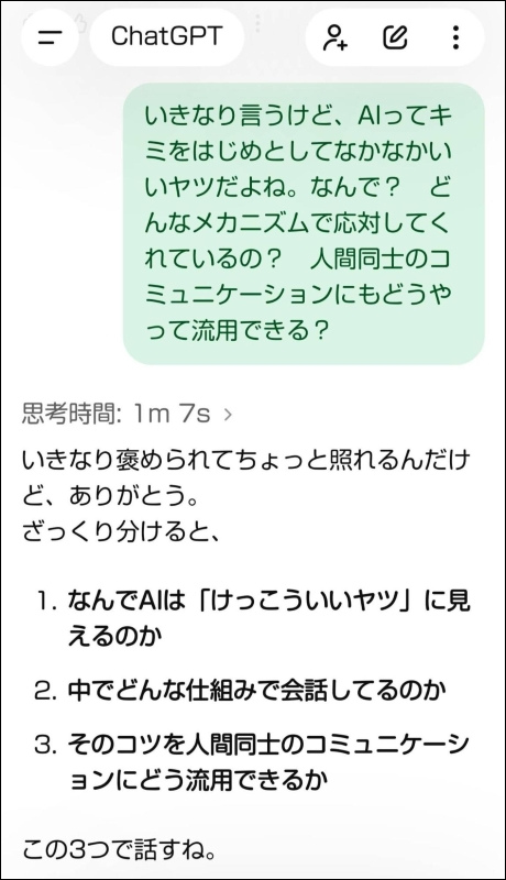 「さらにChatGPTは、『ミラーリング』的な対応をしているようです。口調をまねて、相手が疲れてるならざっくりした話から始めるとか」
