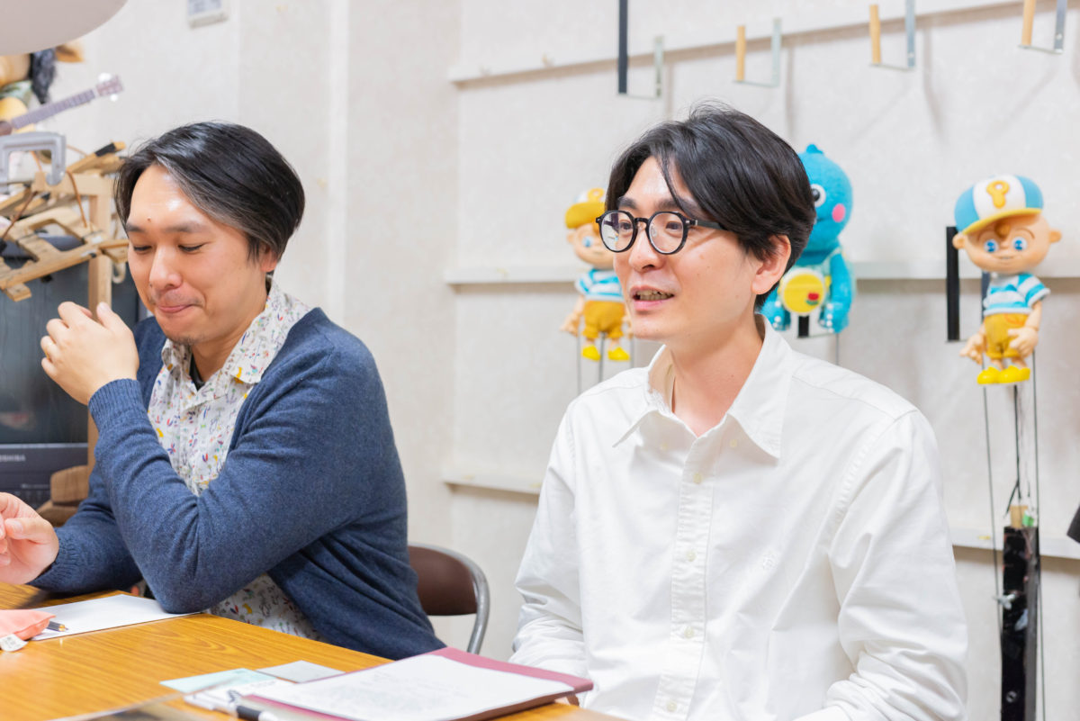 (写真左)西村仁志さん……制作部部長。『ざわざわ森のがんこちゃん』で人形指導を担当。在籍14年目