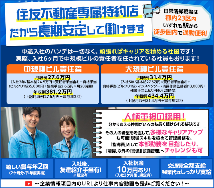| 給与 | [1]責任者候補 月給23万円〜 ※責任者となった場合、月給24.5万円〜(担当規模・役割により段階的に昇給 月収例26.1万円(入社2年/基本給23万円+資格手当5,000円+残業手当2.6万円※月20時間) 年収例360.2万円(上記月収例26.1万円+賞与年2回) [2]日常清掃 月給22万円〜 月収例24.6万円(入社1年/未経験/基本給22万円+残業手当2.6万円※月20時間) 年収例339.2万円(上記月収例24.6万円+賞与年2回) ※残業代はしっかり支給いたします |