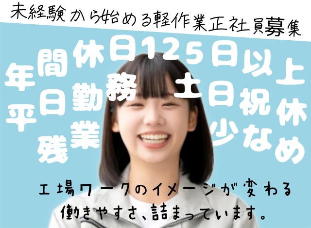 | 資格・経験 | ■必須条件なし/未経験歓迎求人! ■学歴不問/経験不問/資格不問 ■第二新卒OK/ブランク歓迎 未経験スタートが多く活躍する理由  ̄V ̄ ̄ ̄ ̄ ̄ ̄ ̄ ̄ ̄ ̄ ̄ ̄ ̄ 1)難しい作業なしのシンプルな軽作業 2)重量物や力作業なく無理なく勤務可能 3)簡単作業なのに、入社後の業務研修が充実 4)未経験入社をきちんとサポートする環境 5)綺麗な工場内で初めての工場ワークの方も働きやすい |
