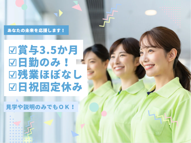 \\ポイントのご紹介// 【夜勤なし】身体も心も安定できる 【ほぼ残業ゼロ】ゆとりを持って無理なく働ける 【賞与3.5か月分】きちんと評価&安心の収入 【復職応援】安心サポートで再構築できる環境 教育・...
